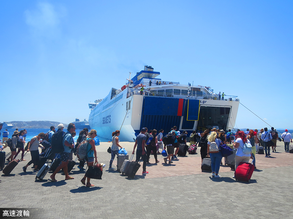搭乘高速渡輪前往另一個充滿童話般藍白石塊屋的米克諾斯島。